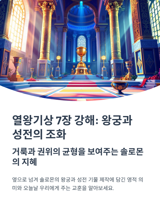 열왕기상 14장 강해 주석 – 신탁과 심판, 하나님의 경고는 결코 헛되지 않는다목차 열왕기상 14장 개요본문 주석 – 아히야의 예언과 여로보암 가문의 몰락히브리어 원문 분석숨겨진 불신앙, 드러난 심판의 칼날구약적 해석신약적 해석교회사적 해석오늘날의 적용관련 찬송가 추천1. 열왕기상 14장 개요열왕기상 14장은 여로보암이 아들의 병을 고치기 위해 변장한 아내를 선지자 아히야에게 보냄으로써 시작되며, 아히야는 그녀에게 하나님의 심판과 북왕국의 몰락에 대한 신탁을 선포합니다. 여로보암은 우상숭배와 종교 왜곡의 죄로 인해 자손을 잃고, 그의 집안은 완전히 끊어질 것이라는 엄중한 심판을 받습니다. 이어 남유다 르호보암 시대의 타락상도 함께 기록되며, 남북 모두 영적 쇠락기에 접어들었음을 보여줍니다.열왕기상 13장..