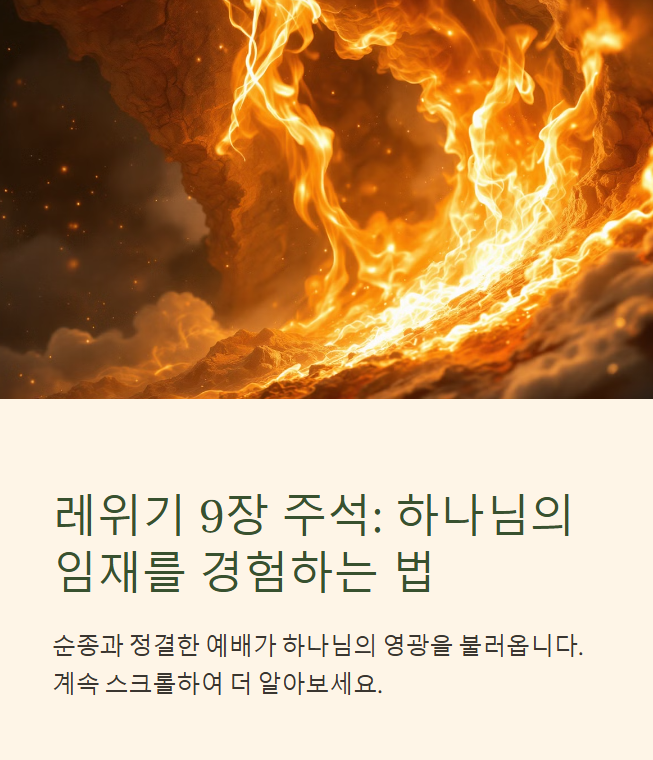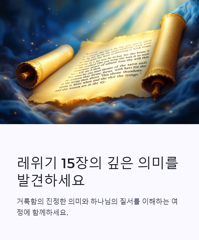 레위기 15장 강해 주석 - 유출에 대한 정결법과 하나님의 거룩한 질서목차레위기 15장 개요본문 주석 – 남녀의 유출과 정결 규례히브리어 원문 분석정결법의 상징성과 목적구약적 해석신약적 해석교회사적 해석오늘날 이 말씀을 어떻게 받아들여야 할까?관련 찬송가 추천1. 레위기 15장 개요 레위기 15장은 남성과 여성에게서 발생하는 유출 현상에 대한 정결 규례를 다룹니다. 이는 개인 위생이나 단순 생리학적 관심을 넘어, 하나님의 거룩함 앞에 인간의 육체성이 어떻게 다뤄져야 하는지를 가르치는 장입니다.📖 레위기 15:31"너희는 이와 같이 이스라엘 자손이 그들의 부정에서 떠나게 하여... 그들 가운데 내 성막을 더럽히지 않게 할지니라."레위기 9장 주석 - 제사 시작과 하나님의 임재 레위기 9장 주석 - 제사 ..