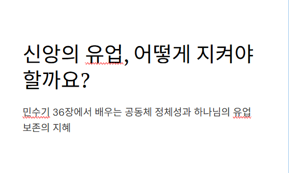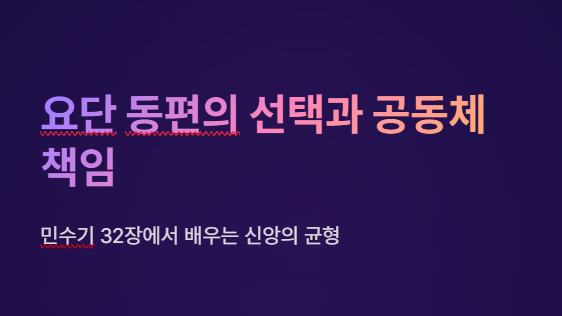민수기 36장 주석 - 유업의 보존과 공동체의 신실함 목차민수기 36장 개요본문 주석 – 슬로브핫 딸들의 기업과 지파의 정체성히브리어 원문 분석유업과 공동체의 균형구약적 해석신약적 해석교회사적 해석오늘날 이 말씀을 어떻게 받아들여야 할까?관련 찬송가 추천1. 민수기 36장 개요 민수기 마지막 장인 36장은 다시 한 번 슬로브핫의 딸들의 유업 문제로 돌아옵니다. 그들의 유업이 다른 지파로 넘어가지 않도록, 동일 지파 내 결혼이라는 해법을 통해 공동체 정체성과 하나님의 유업이 보존됩니다.📖 민수기 36:6"여호와께서 요셉 자손의 지파에 대하여 명령하신 말씀이 이러하니라... 그들은 자기들의 조상 지파의 가족들에게 시집갈 것이니..."2. 본문 주석 – 슬로브핫 딸들의 기업과 지파의 정체성 히브리어 원문 분..