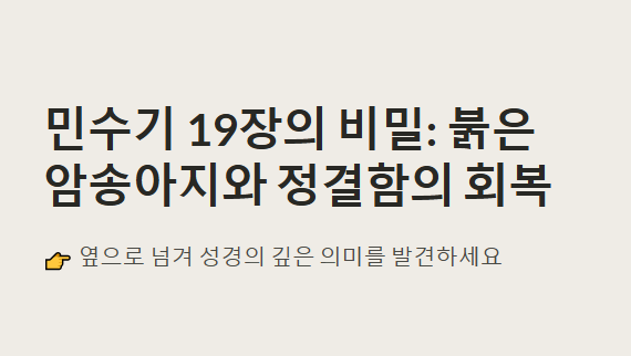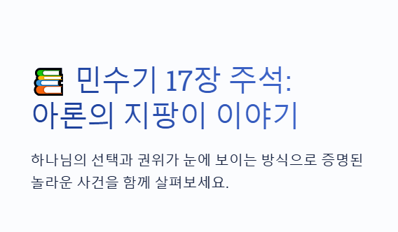 민수기 26장 강해 주석 - 새로운 세대를 위한 인구 조사 목차민수기 26장 개요본문 주석 – 광야 세대의 마무리와 가나안 세대를 준비함히브리어 원문 분석지파별 인구와 기업 분배 기준구약적 해석신약적 해석교회사적 해석오늘날 이 말씀을 어떻게 받아들여야 할까?관련 찬송가 추천1. 민수기 26장 개요 민수기 26장은 출애굽 후 두 번째 인구 조사로, 40년 광야 여정이 끝나갈 무렵 가나안 정복을 앞둔 새로운 세대의 숫자와 분포를 기록합니다. 이는 단순한 숫자의 집계가 아니라, 약속의 땅을 유업으로 받을 준비된 하나님의 백성의 명단으로서 중요한 신학적 의미를 지닙니다.📖 민수기 26:64–65"그들 중에는 모세와 아론이 시내 광야에서 계수한 이스라엘 자손은 하나도 없었으니... 여호와께서 그들이 반드시 광야..