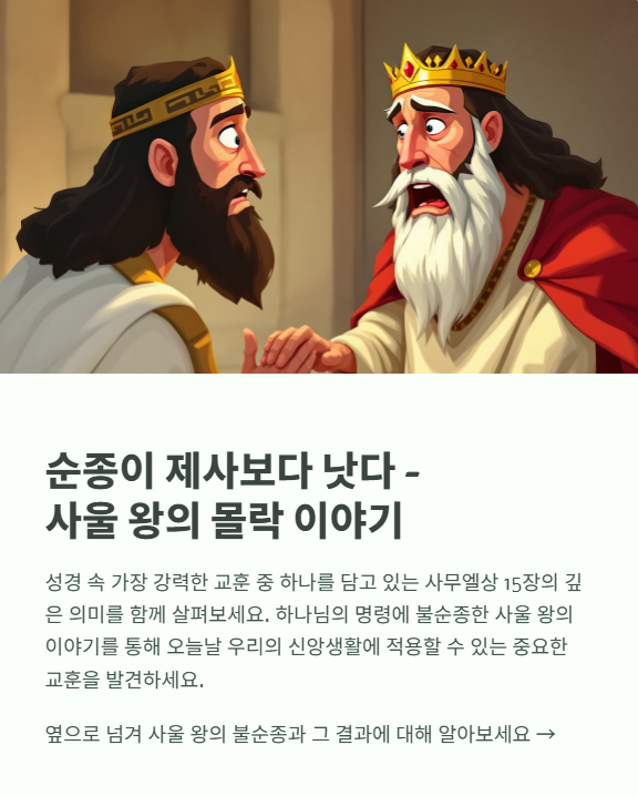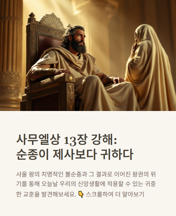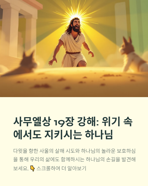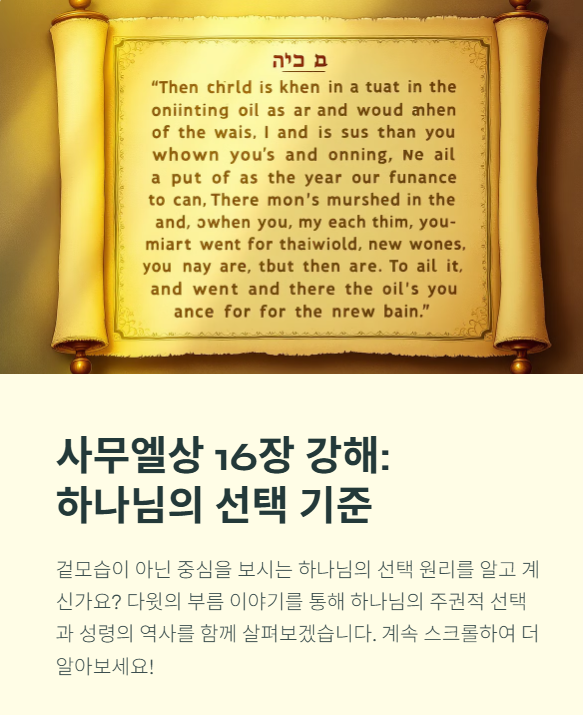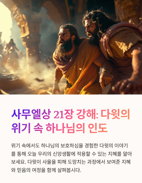 사무엘상 21장 강해 주석 – 다윗의 도피와 하나님의 인도 목차사무엘상 21장 개요본문 주석 – 제사장 아히멜렉과 가드 왕 아기스히브리어 원문 분석다윗의 위기 대응구약적 해석신약적 해석교회사적 해석오늘날의 적용관련 찬송가 추천1. 사무엘상 21장 개요 사무엘상 21장은 다윗이 사울의 위협을 피해 도망치는 과정에서 겪는 다양한 위기와 하나님의 보호를 보여줍니다. 다윗은 굶주림 속에서 제사장 아히멜렉을 찾아가 도움을 요청하고, 골리앗의 칼을 얻게 됩니다. 이후 가드 왕 아기스에게 피신하지만 신변의 위협을 느끼고 지혜롭게 위기를 모면합니다. 이 장은 인간의 연약함 속에서도 하나님의 신실한 보호가 어떻게 드러나는지를 분명히 보여줍니다. 또한 극한 상황에서 신앙인이 어떻게 처신해야 하는지를 교훈합니다. 📖 사무..
