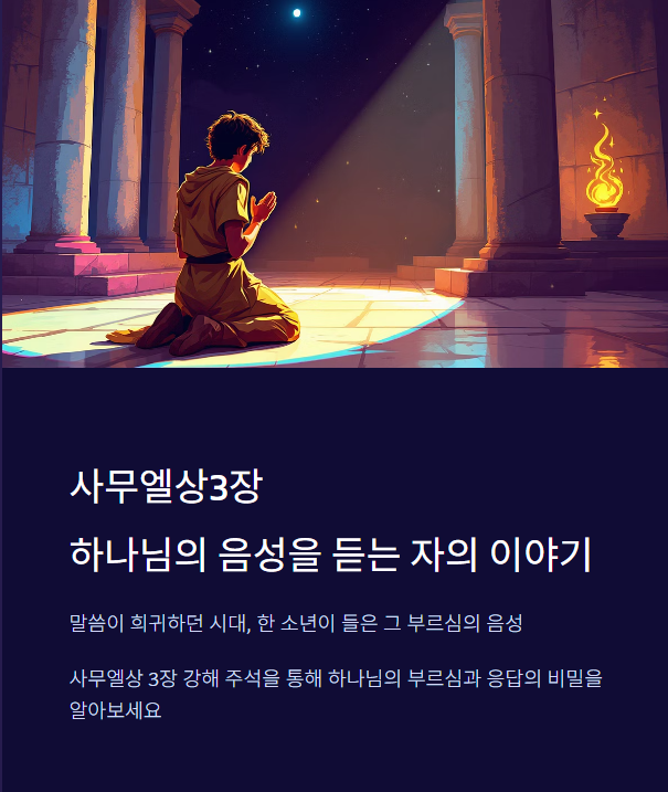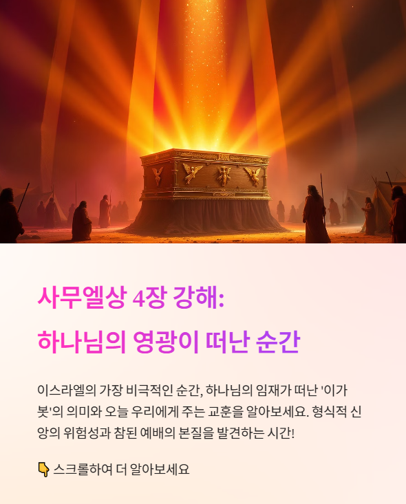 사무엘상 11 강해 주석 – 사울의 첫 승리와 이스라엘의 통합 목차사무엘상 11장 개요본문 주석 – 암몬 사람 나하스의 위협과 사울의 구원히브리어 원문 분석사울의 리더십 발휘구약적 해석신약적 해석교회사적 해석오늘날의 적용관련 찬송가 추천1. 사무엘상 11장 개요 사무엘상 11장은 사울이 기름 부음을 받은 이후 처음으로 왕으로서 지도력을 입증하는 사건을 기록하고 있습니다. 암몬 사람 나하스가 길르앗 야베스를 공격하며 이스라엘을 위협하고, 이로 인해 백성들은 큰 두려움에 휩싸이게 됩니다. 그러나 하나님의 영에 감동된 사울은 이 위기를 기회로 삼아 민족을 하나로 결집시키고, 첫 승리를 거두며 자신의 왕권을 확고히 세우게 됩니다.사무엘상 1장 강해 주석 - 눈물의 기도에서 시작된 하나님의 응답 사무엘상 1장 강..