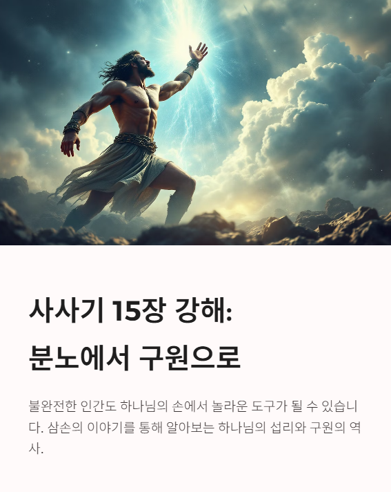 사사기 16장 강해 주석 - 삼손과 들릴라, 최후의 희생과 하나님의 승리 목차사사기 16장 개요본문 주석 – 유혹, 배신, 그리고 마지막 기도히브리어 원문 분석하나님의 은혜는 끝까지 유효하다구약적 해석신약적 해석교회사적 해석오늘날 이 말씀을 어떻게 받아들여야 할까?관련 찬송가 추천1. 사사기 16장 개요사사기 16장은 삼손의 삶의 마지막 장면과 사역의 종결을 기록한 본문입니다.그는 들릴라라는 여인에게 빠져 자신의 힘의 근원을 폭로하고, 결국 블레셋에게 포로로 잡히고 눈이 뽑힌 채 조롱거리가 됩니다.그러나 마지막 순간, 삼손은 하나님께 부르짖으며 다시 한 번 능력을 받아 죽는 순간에 더 많은 적을 무찌릅니다.📖 사사기 16:30"그가 죽을 때에 죽인 자가 살았을 때에 죽인 자보다 더욱 많았더라." 2. ..