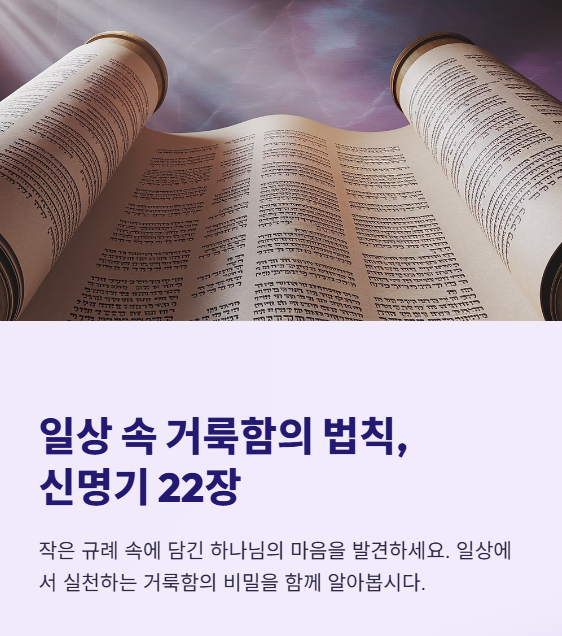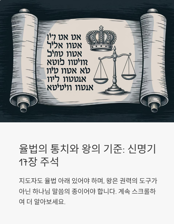 신명기 24장 강해 주석 - 약자를 위한 정의, 공동체의 자비 목차신명기 24장 개요본문 주석 – 이혼, 담보, 품삯, 이웃사랑의 실천히브리어 원문 분석사회적 약자를 향한 하나님의 마음구약적 해석신약적 해석교회사적 해석오늘날 이 말씀을 어떻게 받아들여야 할까?관련 찬송가 추천1. 신명기 24장 개요신명기 24장은 이혼 후 재혼 금지, 담보 규례, 고용인 보호, 이방인과 고아, 과부를 위한 자비의 명령 등을 통해, 하나님 백성 공동체가 정의와 긍휼을 실천하는 삶의 자세를 가져야 함을 강조합니다.📖 신명기 24:17"너는 객이나 고아의 송사를 억울하게 하지 말며... 과부의 옷을 전당 잡지 말라."2. 본문 주석 – 이혼, 담보, 품삯, 이웃사랑의 실천히브리어 원문 분석 ‘세페르 크리투트’ (סֵפֶר כ..