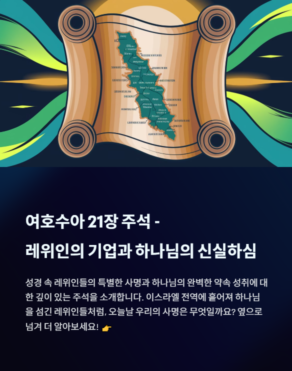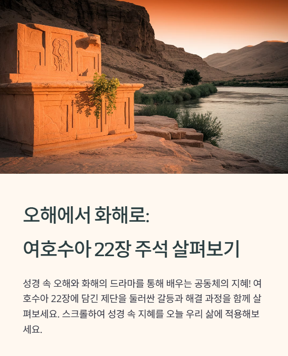 여호수아 24장 강해 주석 - 세겜 언약과 여호수아의 마지막 결단 목차여호수아 24장 개요본문 주석 – 세겜에서의 언약 갱신히브리어 원문 분석하나님만 섬기겠다는 고백구약적 해석신약적 해석교회사적 해석오늘날 이 말씀을 어떻게 받아들여야 할까?관련 찬송가 추천1. 여호수아 24장 개요 여호수아 24장은 이스라엘 백성과 여호수아가 세겜에서 언약을 갱신하는 장면과,그 후 여호수아의 죽음 및 엘르아살의 죽음과 요셉의 뼈 매장 사건까지 기록하며 여호수아서를 마무리합니다.이 장은 하나님의 구속사 요약, 신앙 고백, 순종의 서약, 지도자의 생애 정리까지 포함한 깊은 감동의 본문입니다.📖 여호수아 24:15"오직 나와 내 집은 여호와를 섬기겠노라."여호수아 1장 강해 주석 - 강하고 담대하라, 언약의 땅으로의 첫걸음 ..