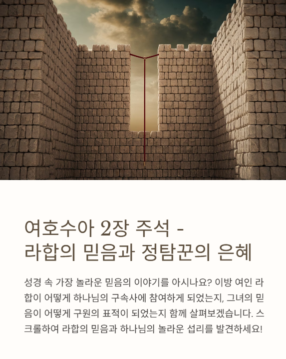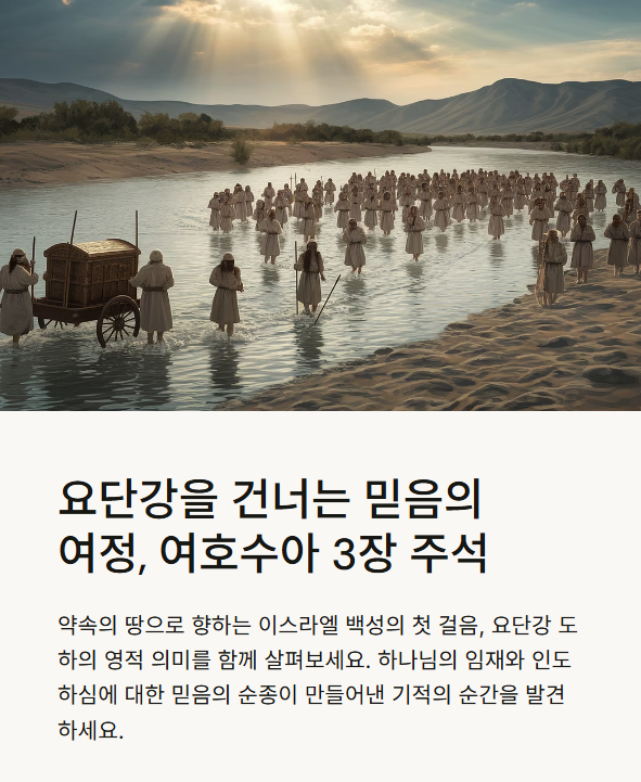 여호수아 4장 강해 주석 - 기념돌과 세대 간 신앙의 기억 목차여호수아 4장 개요본문 주석 – 기념돌과 신앙의 계승히브리어 원문 분석하나님의 구원 역사의 기억구약적 해석신약적 해석교회사적 해석오늘날 이 말씀을 어떻게 받아들여야 할까?관련 찬송가 추천1. 여호수아 4장 개요여호수아 4장은 이스라엘 백성이 요단강을 건넌 후, 그 기적을 기념하기 위해 열두 기념돌을 세우는 사건을 기록합니다.이 기념은 단순한 표식이 아니라, 하나님이 하신 일을 기억하고 후대에 전하기 위한 신앙 교육의 장치입니다.📖 여호수아 4:6–7"이것이 너희 중에 표징이 되리라. 후에 너희 자손들이 묻기를 이 돌들은 무슨 뜻이냐 하거든..."2. 본문 주석 – 기념돌과 신앙의 계승히브리어 원문 분석 ‘에벤’ (אֶבֶן) – 돌. 굳건함..