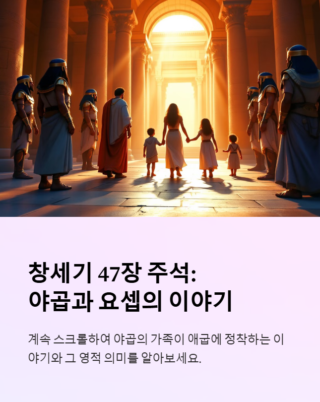 창세기 50장 강해 주석 - 야곱의 장례와 요셉의 용서 📍 설교 자료 다운로드 👉 📍 성경 구절 PPT 다운로드 👉 목차창세기 50장 개요본문 주석 – 야곱의 장례와 요셉의 형제 용서히브리어 원문 분석요셉의 신앙과 하나님의 섭리구약적 해석야곱의 죽음과 가나안 땅에 대한 약속요셉의 용서와 하나님 나라의 원리신약적 해석예수 그리스도의 용서와 요셉의 용서하나님의 섭리를 신뢰하는 신자의 삶교회사적 해석초대교회 교부들의 해석종교개혁자들의 해석현대 신학에서의 해석오늘날 이 말씀을 어떻게 받아들여야 할까?관련 찬송가 추천1. 창세기 50장 개요창세기 50장은 야곱의 장례식과 요셉이 형제들을 용서하는 장면을 담고 있습니다. 요셉은 아버지를 애굽에서 장례한 후, 형제들이 자신을 두려워하는 것을 보고 용서와 하나..