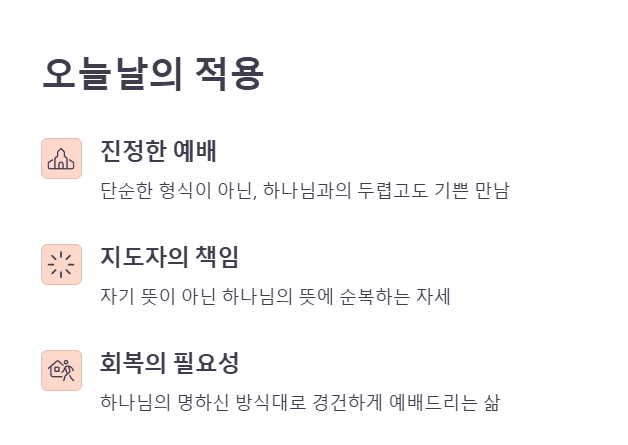 우리의 삶과 예배가 하나님의 뜻과 멀어졌다면, 다시 돌아와 하나님의 명하신 방식대로 경건하게 예배드리는 삶을 회복해야 합니다.