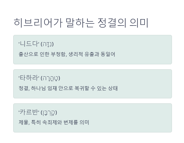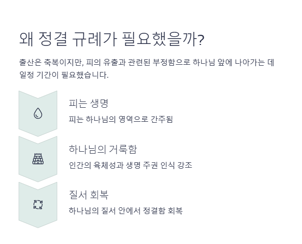 이스라엘 사회에서 피는 생명을 상징하며, 동시에 하나님의 영역으로 간주되었습니다. 출산과 같은 생명 탄생의 과정도 하나님의 질서 안에서 정결함을 회복해야 할 사건으로 여겨졌습니다.