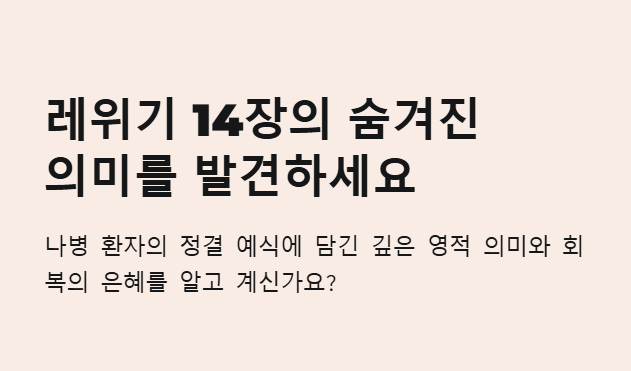 레위기 14장은 나병 환자가 병에서 나은 후, 공동체와 하나님 앞에 정결하게 복귀하는 예식 절차를 설명합니다. 이는 단순한 치료가 아닌, 영적·사회적 회복을 포함한 완전한 회복을 상징합니다.