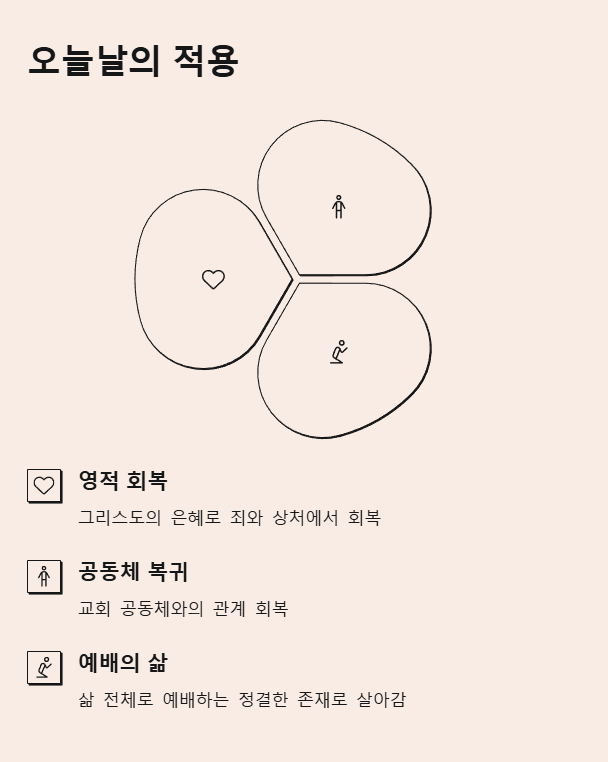 오늘날 우리도 죄와 상처에서 그리스도의 은혜로 회복되어, 교회 공동체와의 관계를 새롭게 하고, 삶 전체로 예배하는 정결한 존재로 살아가야 합니다.