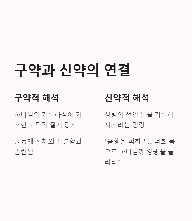 신약에서도 성적 순결은 매우 중요하게 다루어지며, 성령의 전인 몸을 거룩히 지키라는 명령으로 연결됩니다.