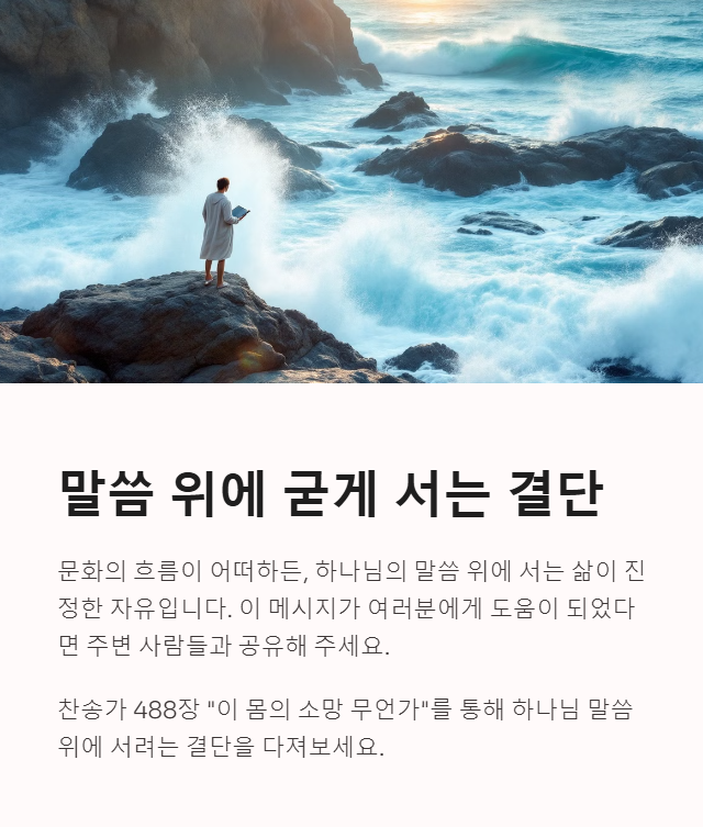 이 세상의 유혹과 가치관 속에서도 오직 하나님 말씀 위에 서려는 결단의 찬송입니다.