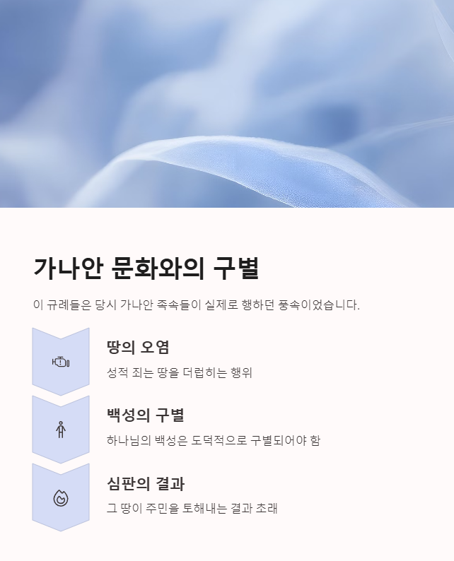 이 장에서 열거된 규례들은 단지 도덕률이 아니라, 당시 가나안 족속들이 실제로 행하던 풍속이었습니다. 하나님은 이스라엘 백성이 그 땅을 더럽히지 않도록 철저히 구별된 삶을 요구하셨습니다.