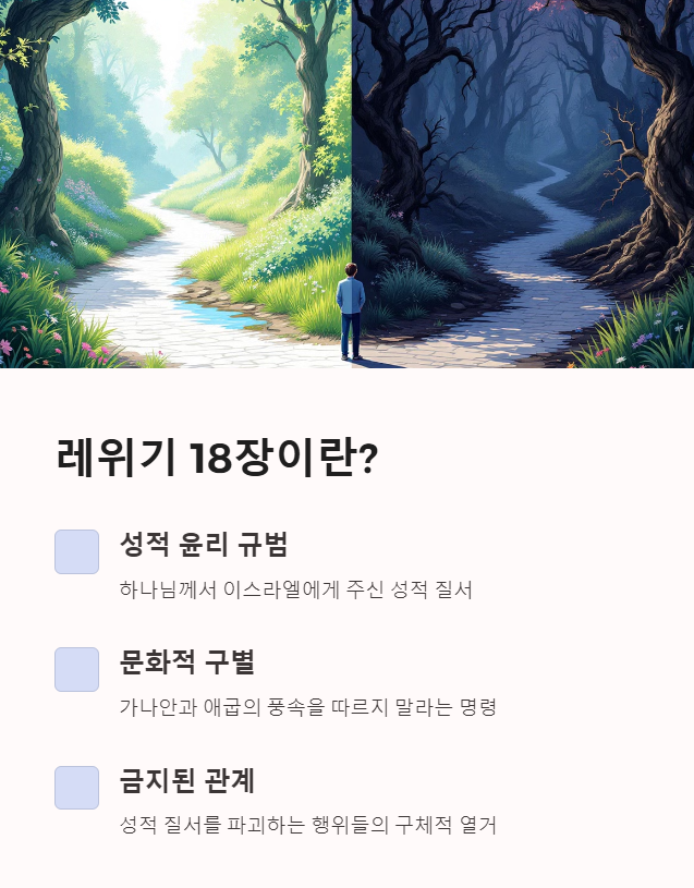 레위기 18장은 하나님께서 이스라엘 백성에게 주신 성적 윤리 규범으로, 가나안과 애굽의 풍속을 따르지 말고 하나님의 규례를 지키라는 명령으로 시작됩니다.