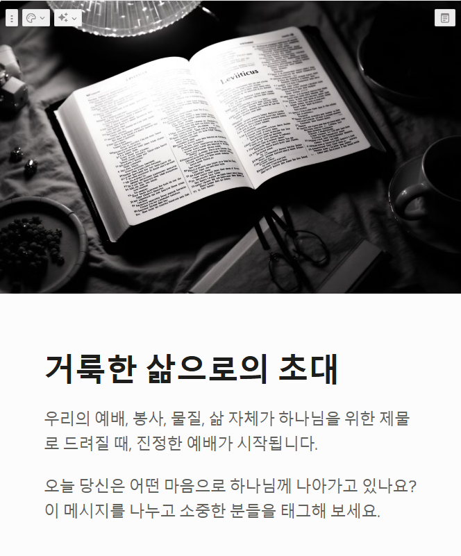 우리는 우리의 삶 전체를 하나님께 드리는 영적 제사장으로서의 정체성을 회복해야 합니다.