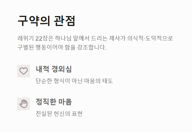 이는 단순한 외적 형식이 아니라, 하나님을 향한 내적 경외심과 정직한 마음이 표현된 행위였으며, 제사장과 제물 모두가 그 거룩함에 합당해야 했습니다.