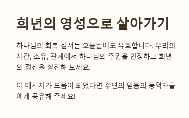 현대 사회에서 안식과 회복의 리듬을 잃어버린 시대에, 이 말씀은 쉼과 회복, 나눔과 자유의 복음을 전파하라는 소명을 줍니다.