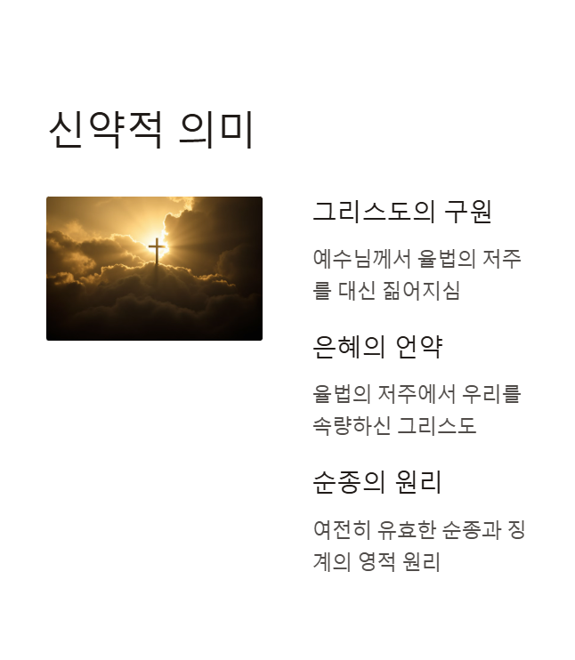 신약은 율법의 징계를 예수 그리스도께서 대신 짊어지심으로, 율법 아래 있는 자를 은혜로 구원하심을 선포합니다.