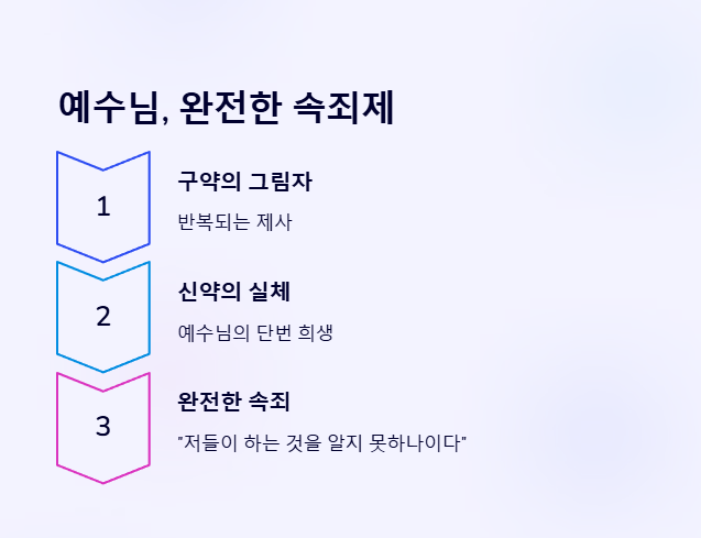 • 구약의 반복된 속죄제는 예수님께서 십자가에서 단번에 완성하신 속죄의 그림자였습니다.