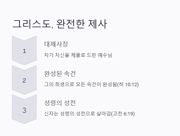 - 예수님은 단순한 제사장이 아니라 자기 자신을 제물로 드린 대제사장이시며, 그의 희생으로 모든 속건이 완성되었습니다(히브리서 10:12).