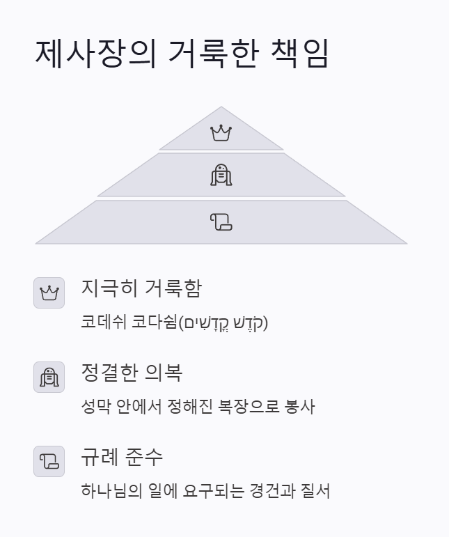 - 제사장은 성막 안에서 정결한 의복을 입고, 정해진 규례를 따라 봉사해야 했습니다.