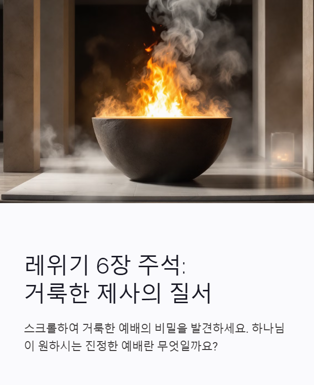 레위기 6장은 5장에서 이어지는 속건제 규례와 함께, 제사장이 수행해야 할 제사의 절차와 규율을 상세히 다룹니다. 이 장은 하나님 앞에서 드려지는 예배가 외적인 행위뿐 아니라, 철저한 질서와 내면의 정결함까지 요구됨을 보여줍니다.