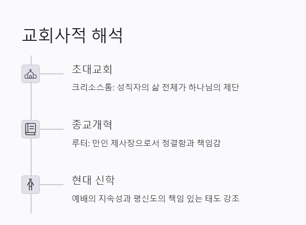 - 크리소스톰은 성직자의 거룩함을 강조하며, 제사장의 삶 전체가 하나님의 제단이어야 한다고 해석했습니다.