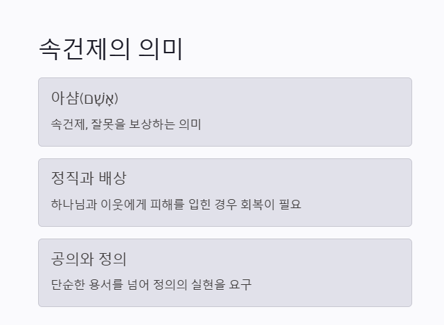 - 예수님은 단순한 제사장이 아니라 자기 자신을 제물로 드린 대제사장이시며, 그의 희생으로 모든 속건이 완성되었습니다(히브리서 10:12).