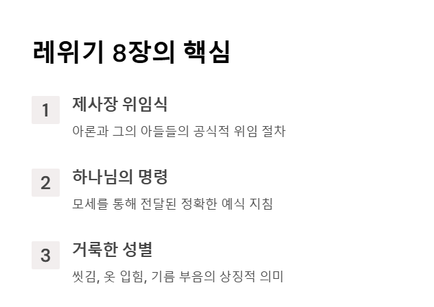 레위기 8장은 아론과 그의 아들들이 제사장으로 공식적으로 위임되는 절차를 상세히 기록합니다. 하나님께서 모세를 통해 명령하신 대로 위임식이 진행되며, 기름부음, 피 바름, 속죄, 번제 등이 포함된 복합적 예식입니다. 이는 하나님의 거룩한 사역자로 부름받은 자들이 어떻게 성별되어야 하는지를 보여줍니다.