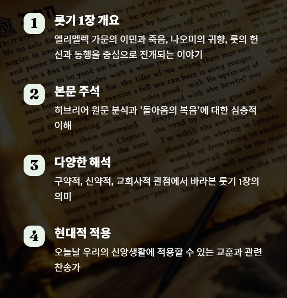 1장은 엘리멜렉 가문의 이민과 죽음, 나오미의 귀향, 룻의 헌신과 동행을 중심으로 전개됩니다.
