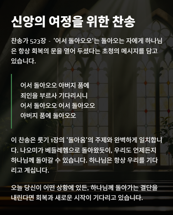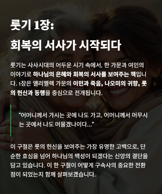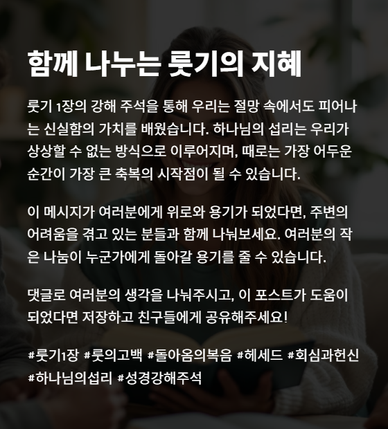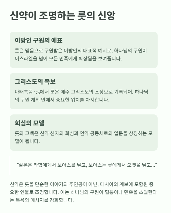 - 이는 이방 여인이 여호와 하나님을 선택하는 구속사적 전환점이 됩니다.