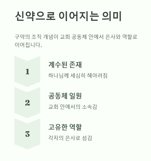 신약에서는 이런 구약의 조직 개념이 교회 공동체 안에서 은사와 역할로 이어집니다.