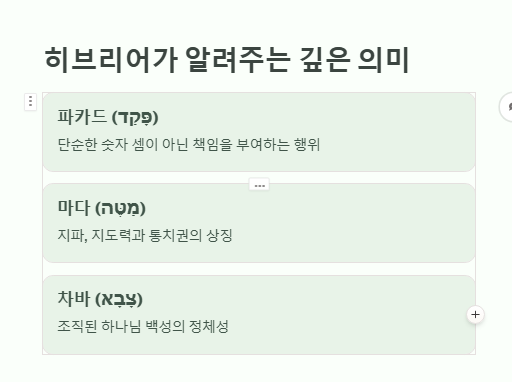 - ‘차바’ (צָבָא) – 군대, 진영. 조직된 하나님의 백성으로서의 정체성을 표현.