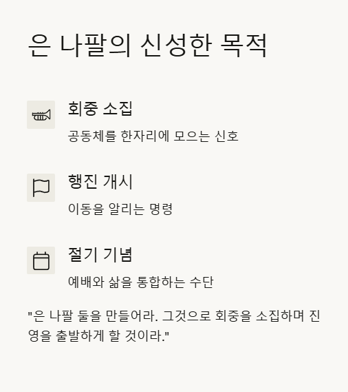 - 나팔의 기능 (10:1–10): 은 나팔은 회중 소집, 행진 개시, 전쟁의 경보, 절기의 기념 등 예배와 삶 전체를 통합하는 신호 수단이었습니다.