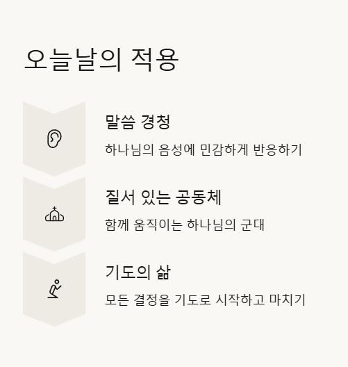또한 광야 행진은 단지 물리적 이동이 아니라, 하나님의 인도와 명령에 대한 민감한 순종의 상징이며, 매 걸음이 말씀 중심으로 정렬되어야 함을 보여줍니다.