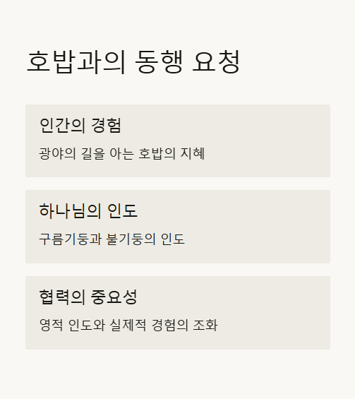 - 호밥과의 동행 요청 (10:29–32): 모세는 장인 호밥에게 길잡이 역할을 제안하며, 공동체의 지혜와 협력을 중시합니다. 이는 하나님의 인도와 인간의 경험이 함께하는 여정을 상징합니다.