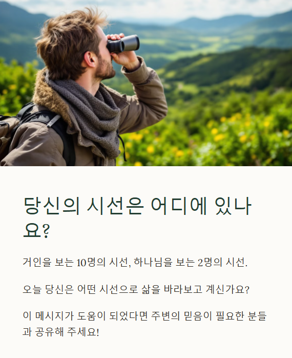 믿음의 시선으로 바라볼 때, 가나안은 두려움의 땅이 아니라, 약속의 땅이 됩니다.