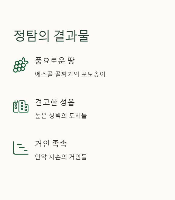 - 정탐의 범위와 내용 (13:1–24): 모세는 정탐꾼들에게 땅의 성격, 주민의 강함 여부, 토지의 비옥함 등을 살피게 합니다. 그들이 가져온 에스골 골짜기의 포도송이는 땅의 풍요로움을 상징합니다.