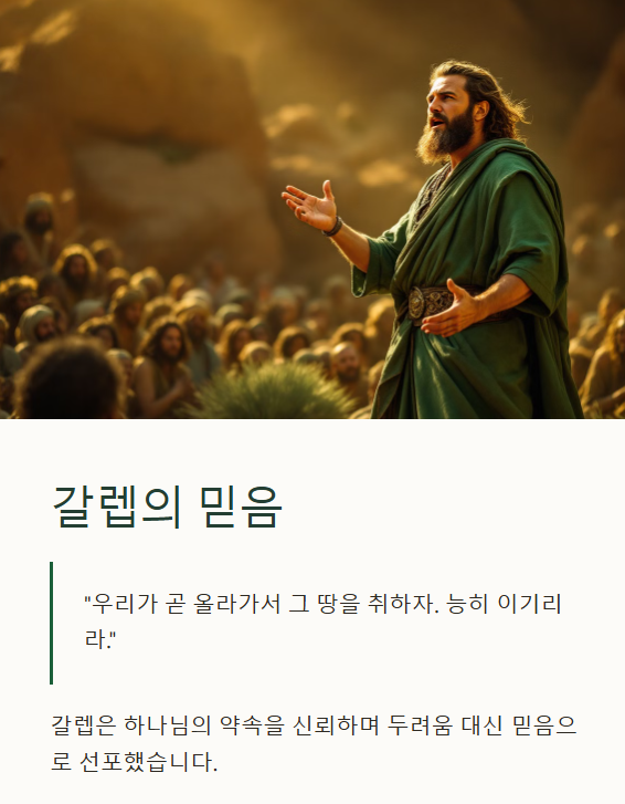 "갈렙이 모세 앞에서 백성을 조용하게 하고 이르되, 우리가 곧 올라가서 그 땅을 취하자. 능히 이기리라 하나..."
