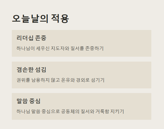 지도자 또한 권위를 남용하지 않고, 온유와 경외로 하나님 앞에 서야 하며, 공동체는 하나님의 말씀 중심으로 질서와 거룩함을 지켜야 합니다.