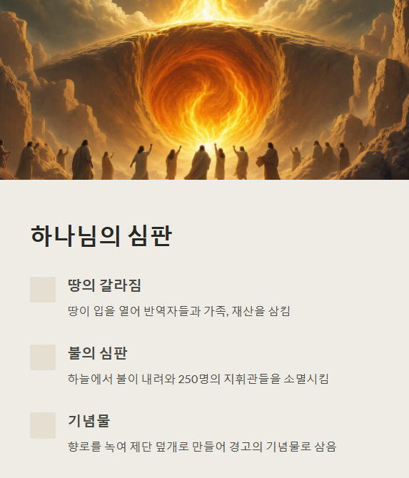 - 하나님의 심판과 땅의 갈라짐 (16:16–35): 하나님은 모세를 통해 반역자들과 그 가족, 재산을 포함해 땅이 삼켜버리는 심판을 집행하십니다.