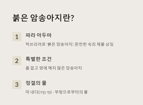 - ‘파라 아두마’ (פָרָה אֲדֻמָּה) – 붉은 암송아지. ‘흠 없고 멍에를 메지 않은’ 조건은 완전한 속죄 제물을 상징함.