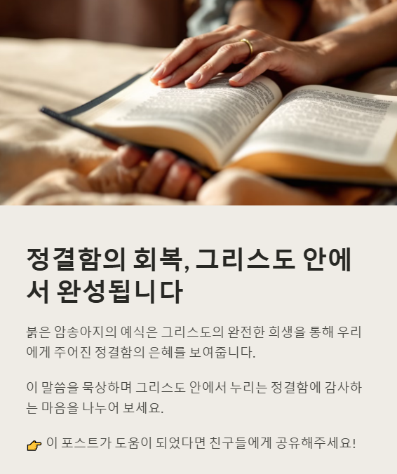 삶 속에서 우리는 그리스도의 피로 거룩함을 유지하며, 세상 가운데 정결함의 통로로 부르심을 받았다는 사실을 잊지 말아야 합니다.