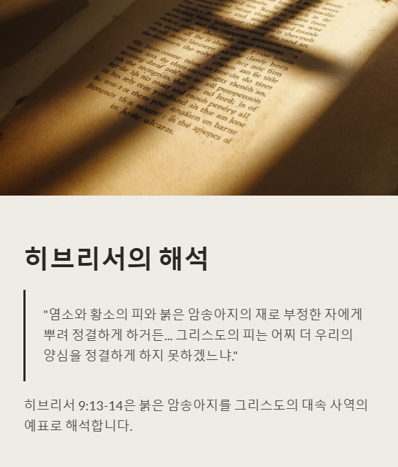 신약은 이 붉은 암송아지의 제사를 예수 그리스도의 대속 사역에 대한 예표로 해석합니다. 예수께서 진 밖에서 고난을 당하심으로 우리를 정결케 하셨고, 죽음을 정복하신 분으로 드러나십니다.