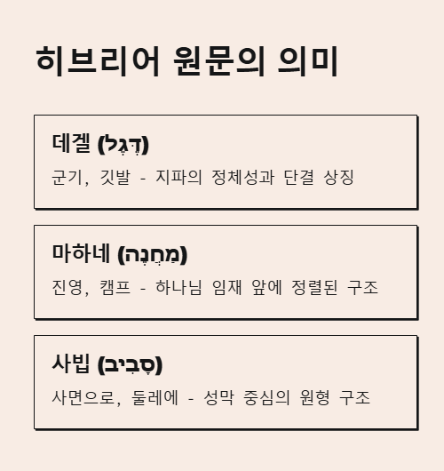- ‘데겔’ (דֶּגֶל) – 군기, 깃발. 지파의 정체성과 단결을 나타내는 상징.
