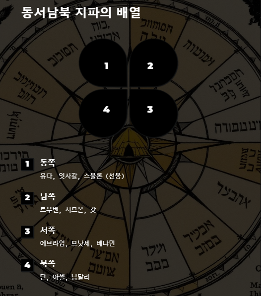 - 남쪽: 르우벤, 시므온, 갓 (2:10–16)