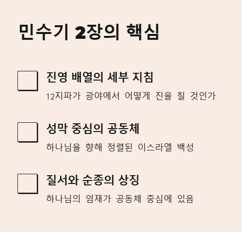 민수기 2장은 단순한 병참 배열이 아니라, 이스라엘의 신정 국가로서의 영적 정체성을 상징합니다.