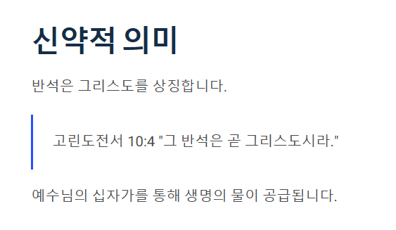 신약에서는 반석이 그리스도를 상징하며, 그 반석에서 생명의 물이 흘러나오듯 예수님의 십자가를 통한 생명 공급으로 해석됩니다.