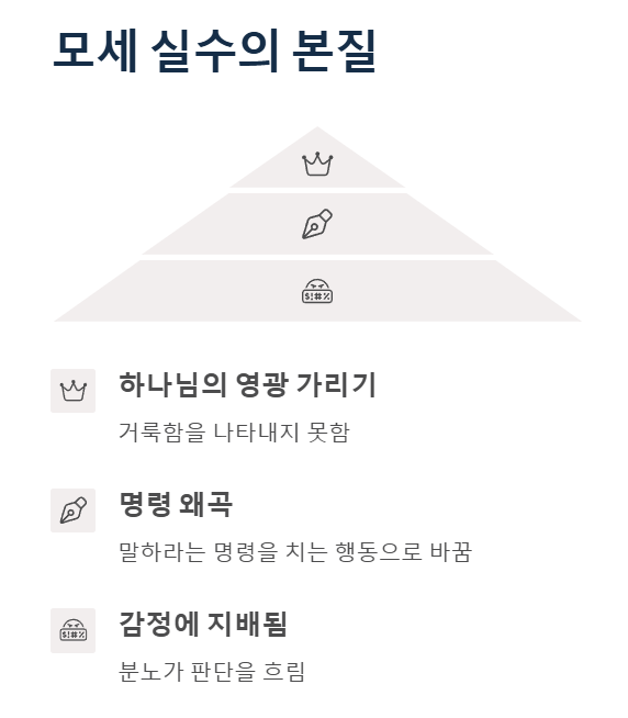 모세의 실수는 그가 하나님의 영광보다 백성의 압력과 자신의 감정을 앞세웠을 때 어떤 결과가 따르는지를 보여주는 교훈입니다.